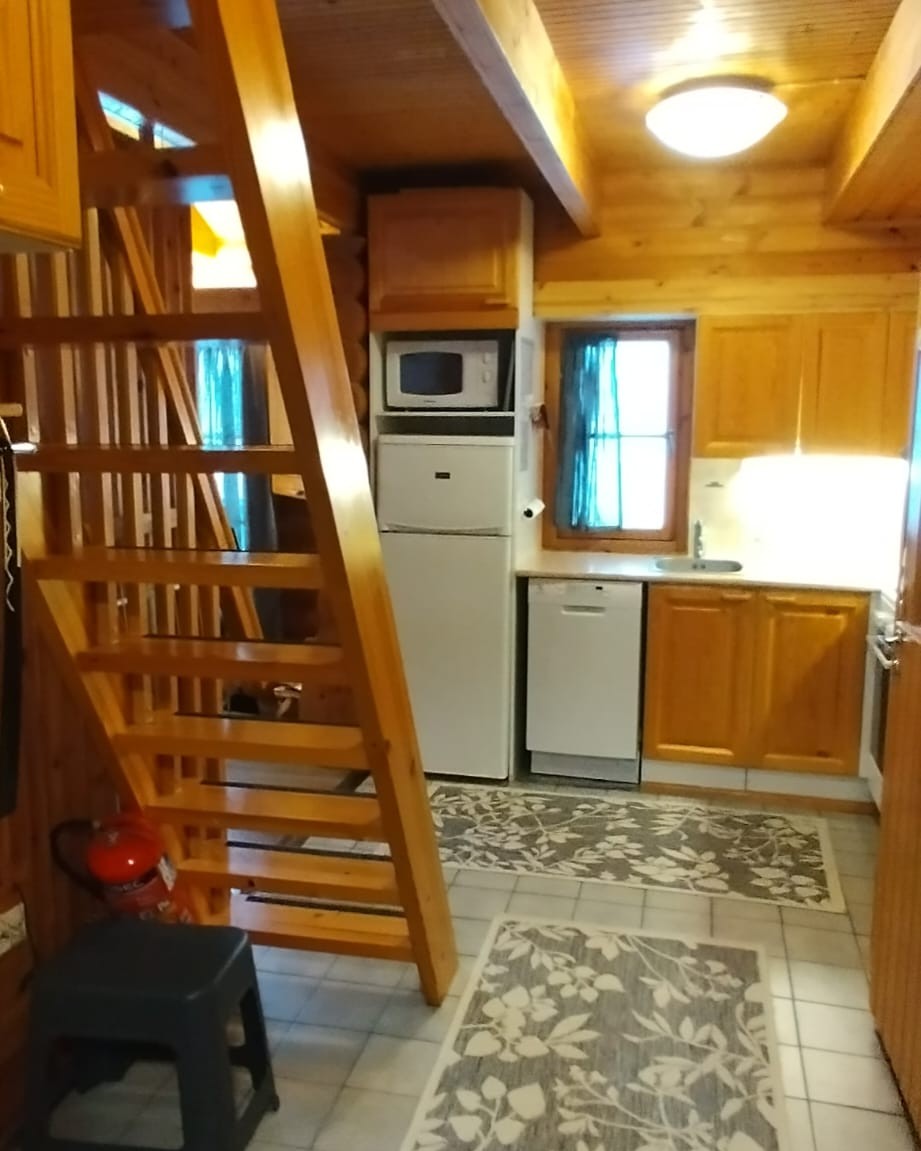 Mökissä on olohuone (jossa takka), makuuhuone + tilava makuuparvi (makuutilat yhteensä kuudelle), koneistettu keittiö ja sauna. Muita varusteita ovat mm. kaasugrilli, pesukone, vaatteiden kuivatuskaappi ja auton lämpöpistoke.